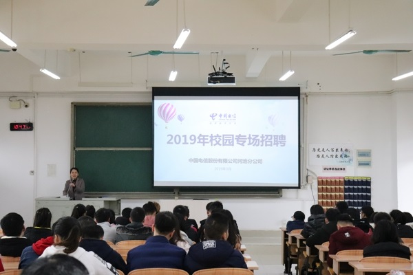 为切实做好计信学院2019届毕业生就业工作,提高2019届毕业生的就业率和就业质量,计信学院积极为毕业生拓宽就业渠道。3月10日上午10:30,中国电信总公司河池分公司应邀在我校东区弘毅楼2-507教室举行现场招聘会。本次招聘会由计信学院2015级年级辅导员杨艳老师主持,由中国电信河池市分公司人力资源总经理做主讲,计信学院分管学生就业工作的领导、老师以及2019届毕业生和部分感兴趣的非毕业生到场聆听。