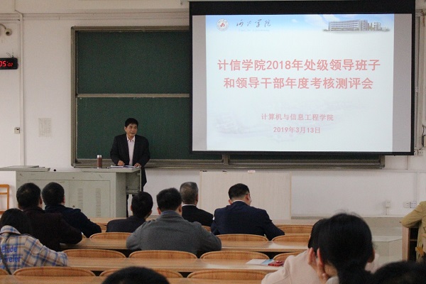 3月13日下午3点,计信学院在弘毅楼2-507室召开2018年处级领导班子和领导干部年度考核测评会,计信学院领导班子和班子成员分别做2018年工作总结汇报和自我测评,计信学院全体教职工参加了本次会议。