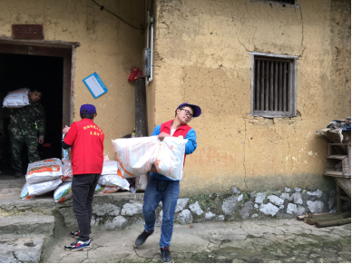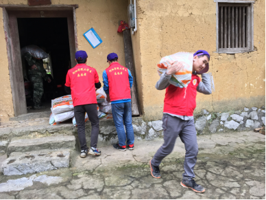 志愿者们帮助农户将肥料抬到田地