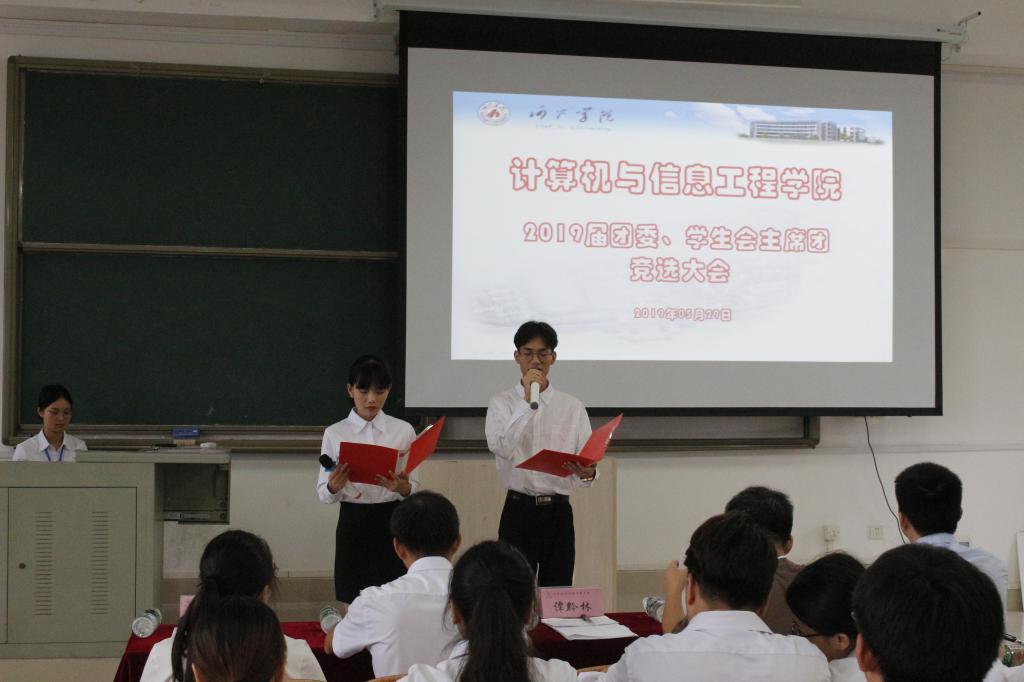 5月30日下午3点,计信学院在弘毅楼2-506室召开了团委、学生会主席团竞选大会。计信学院党委副书记谭黔林、团委书记容万韬、团委副书记耿德华、以及辅导员杨艳、薛建松老师出席大会并任评委,计信学院团委、学生会全体成员、各班级代表、社团代表以及二级学院学生代表也出席了本次大会。