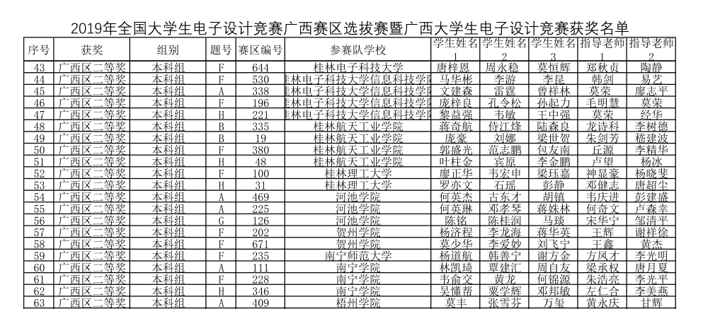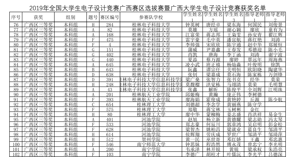 我校由物电学院、计信学院组织的多个参赛队经过前期的艰苦集训以及四天三夜的艰苦竞赛角逐,最终,由梁志勋、阮忠老师指导的覃承谨、何泽平、劳超远赛队斩获国家级二等奖。此外,其他参赛队亦斩获自治区二等奖三项、三等奖四项的好成绩。